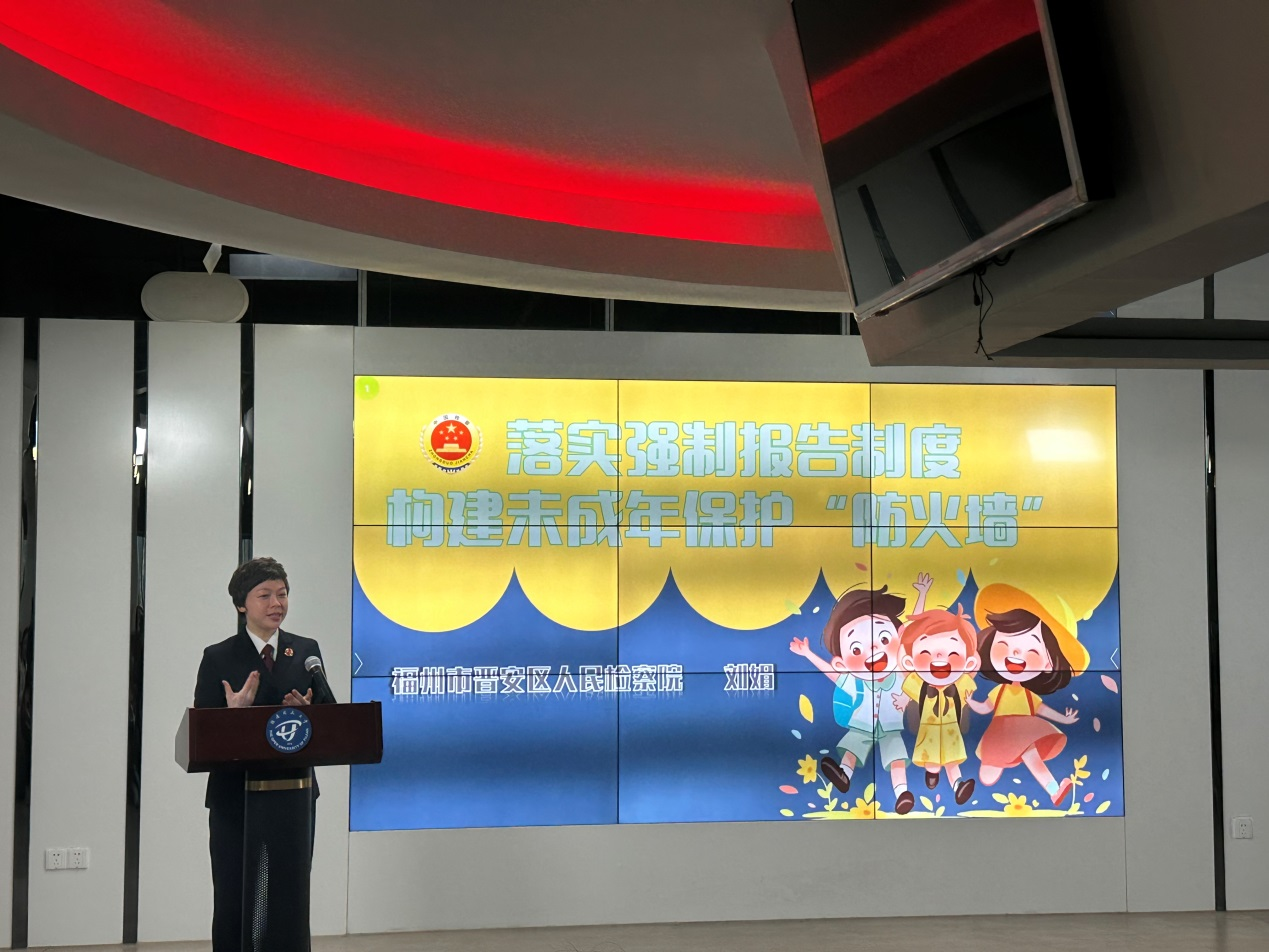 为了加强未成年人保护,推动强制报告制度的实施,明确教职工的责任和义务,并增强学校的防范意识。12月19日下午,福州市晋安区人民检察院刘娟检察官来我校为学生管理干部开展了一场关于强制报告制度的法治讲座。
