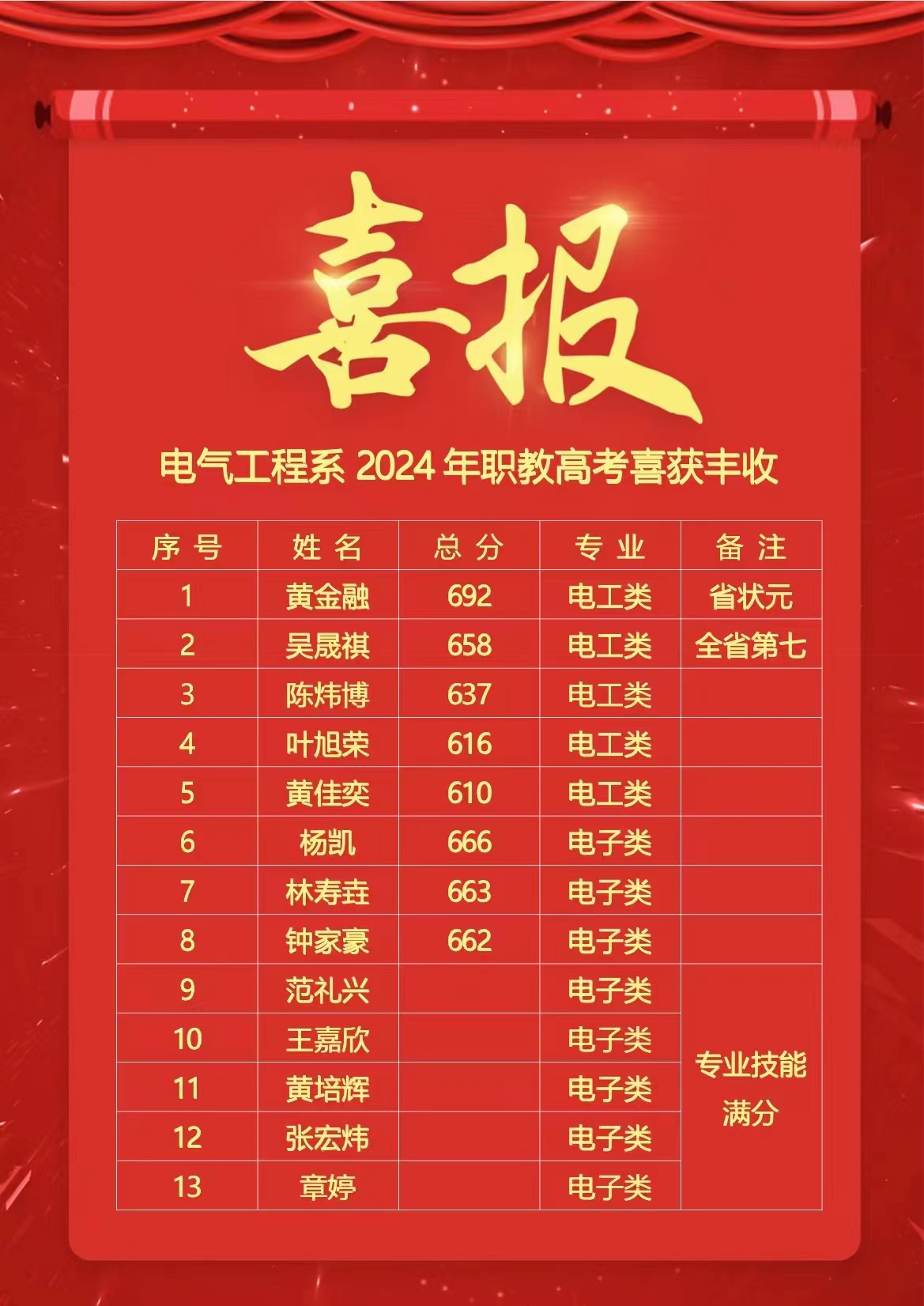 近日,高职分类招生考试分数公布,在全体师生的共同努力下,电气工程系学子不负众望,取得了优异成绩。今年我系共有8人上线本科,其中电工类5人,电子类3人。21级铁道供电2班学生黄金融以692分的总成绩喜提“电工类”全省状元称号。电子专业章婷、王嘉欣、张宏炜、黄培辉、范礼兴五位同学专业技能考试获满分200分。