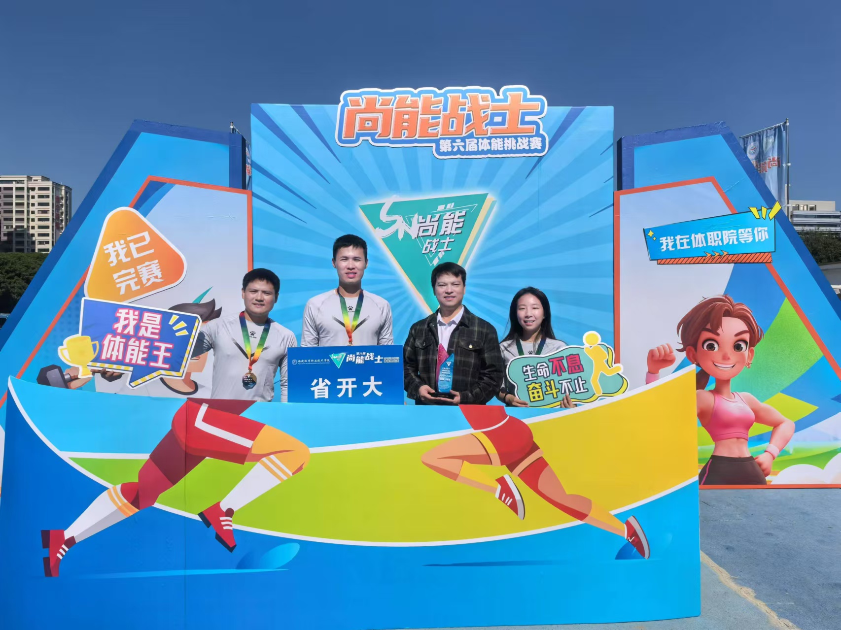 12月1日上午,由共青团福建省委、福建省少工委、福建省直机关团委、福建体育职业技术学院共同举办的第六届“尚能战士”体能挑战赛在福建体育职业技术学院室外田径场开赛。我校体育组吴深、郑少烽两位青年教师与福建开放大学组队参赛。