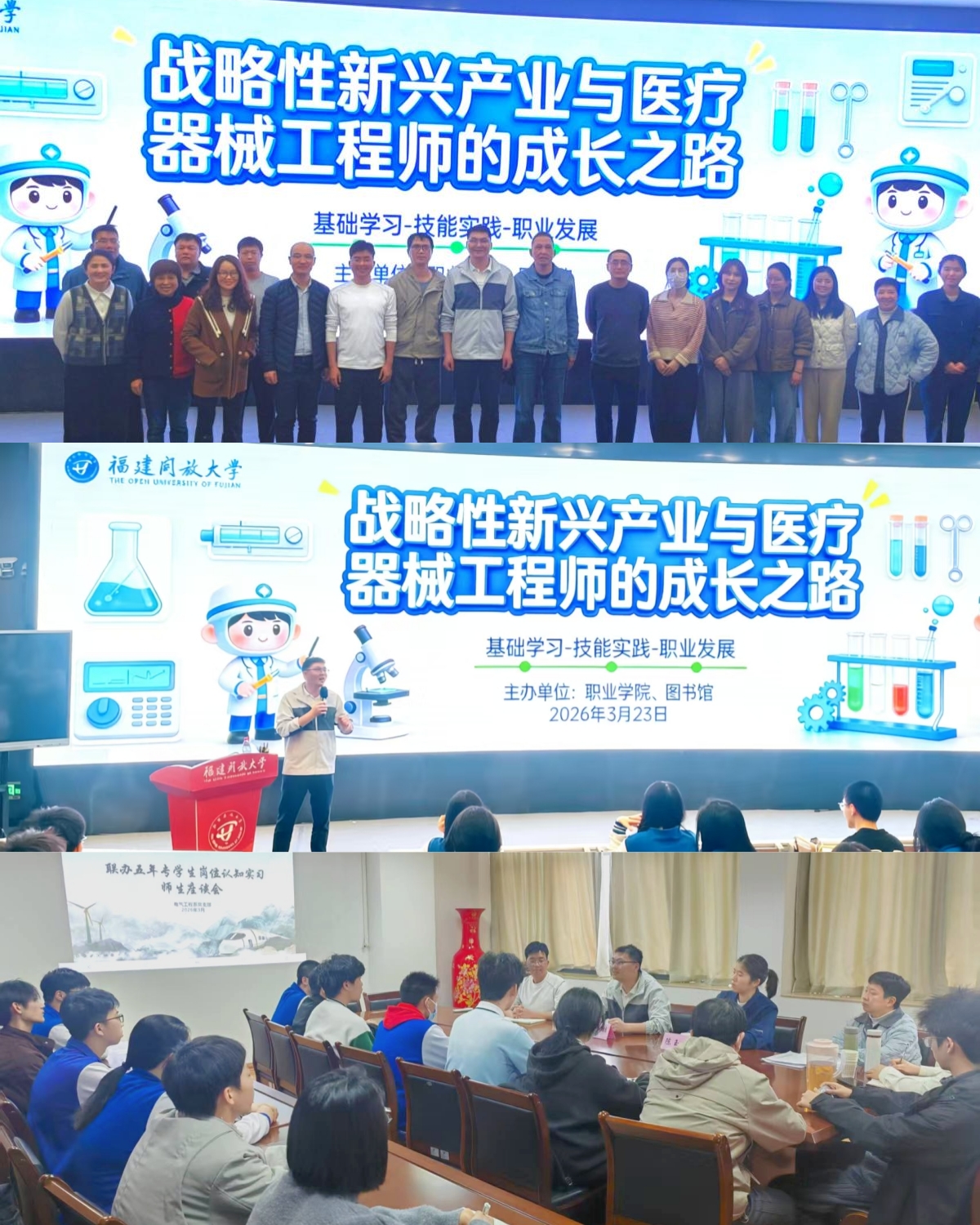 座谈会后,我校邀请福建卫生职业技术学院钟伟雄副教授为师生开展《战略性新兴产业与医疗器械工程师的成长之路》讲座。他结合专业特点与职业发展规律,围绕学生成长成才、职业规划、技能提升等内容展开深入讲解。期间,联办五年专优秀毕业生代表陈玉婷分享了自身在技能竞赛、专升本备考、职业规划制定、技能证书考取等方面的宝贵经验与心得,以朋辈榜样的力量,引导全体学生崇德尚技、勤学笃行、全面发展。