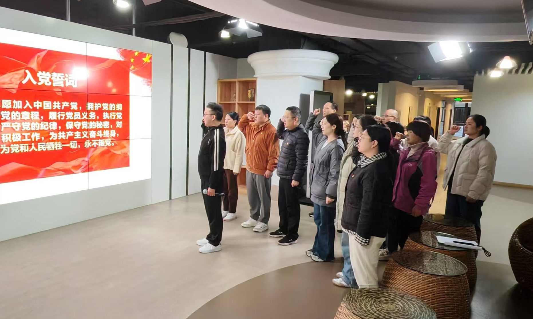 传火炬,育新人。活动最后,支部为经上级党组织批复转为预备党员的何佳、苏斌两位同志配发党员徽章,两位同志在支部书记的带领下进行了入党宣誓,与会正式党员与他们一起重温了入党誓词,庄重而铿锵的誓言在会场中回荡。