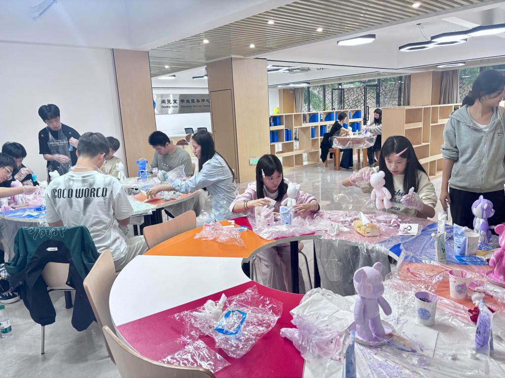 5月28日,“流体熊DIY:泼墨成画,甩走emo!”活动在学生服务中心率先开展。活动现场,同学们手持颜料,自由泼洒、涂抹,将色彩创意倾注于流体熊创作中。在色彩交融间,不仅诞生了一个个独具个性的流体熊作品,更让同学们将日常的压力与负面情绪尽情释放。