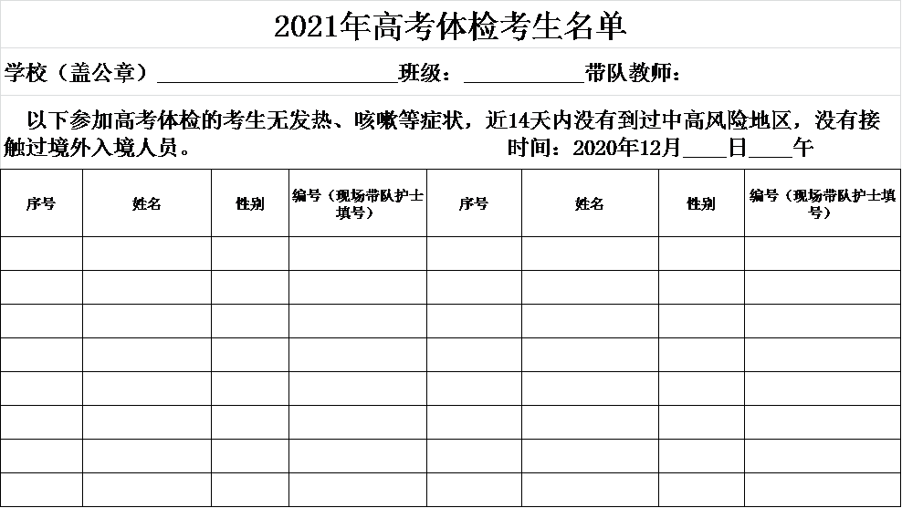 4.班级班主任需要填写“2021年高考体检考生名单”(按模板填写)并按系部汇总提交招生科,盖学校公章并带到现场交给带队护士。