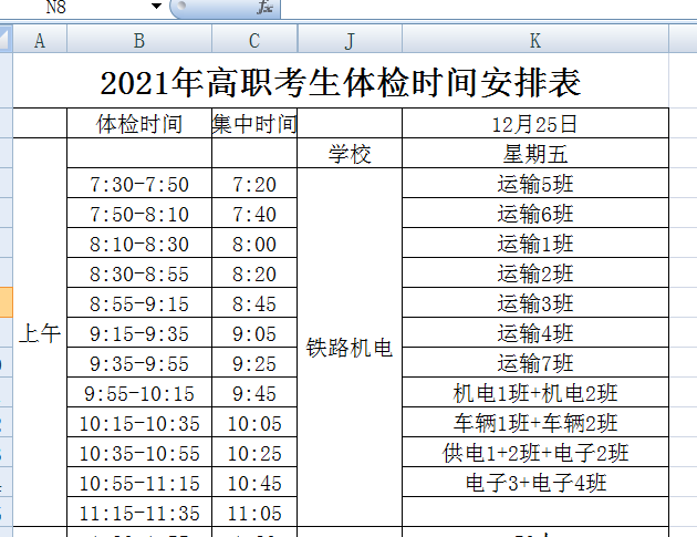 1.按照“2021年高考(高职)考生体检安排表”时间进行集中体检,不同班级按规定集中时间到达指定地点集中,同一班级的都要同一时间到达(有的分两拨体检,但时间间隔较短)。