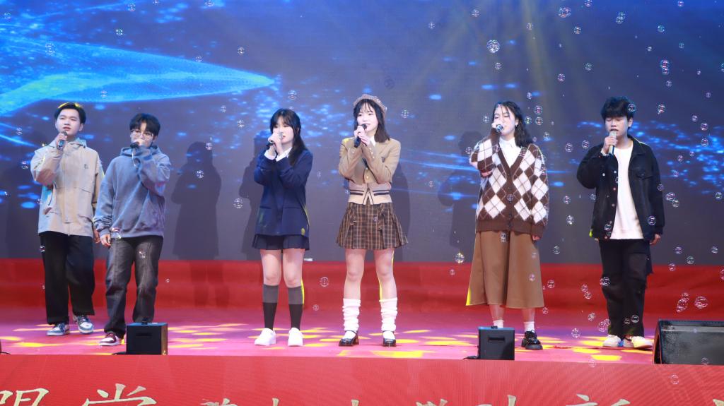 第三篇章中,校声乐社带来合唱《好想爱这个世界啊》用最真诚的歌声,为每一个观众带来温暖的抚慰。心理剧《成为你的一天》惟妙惟肖的表演,向同学们传达了“与其羡慕他人,不如做最好的自己”的道理,发人深思。礼仪时装秀《最炫民族风》将少数民族服装和礼仪深度融合,传承礼仪之风,浸润文明校园,展现了中华民族一家亲。教工合唱《如愿》悠扬的歌声里饱含着中国人血脉里割舍不了的情感,老师们将歌曲中传递的亲情与家国情唱进了观众们的内心。最后,洪建宗、于洁老师献唱《祝福中国》,高亢而优美的旋律,激励着师生在新征程中踔厉奋发,再竞风流。至此,晚会圆满结束。