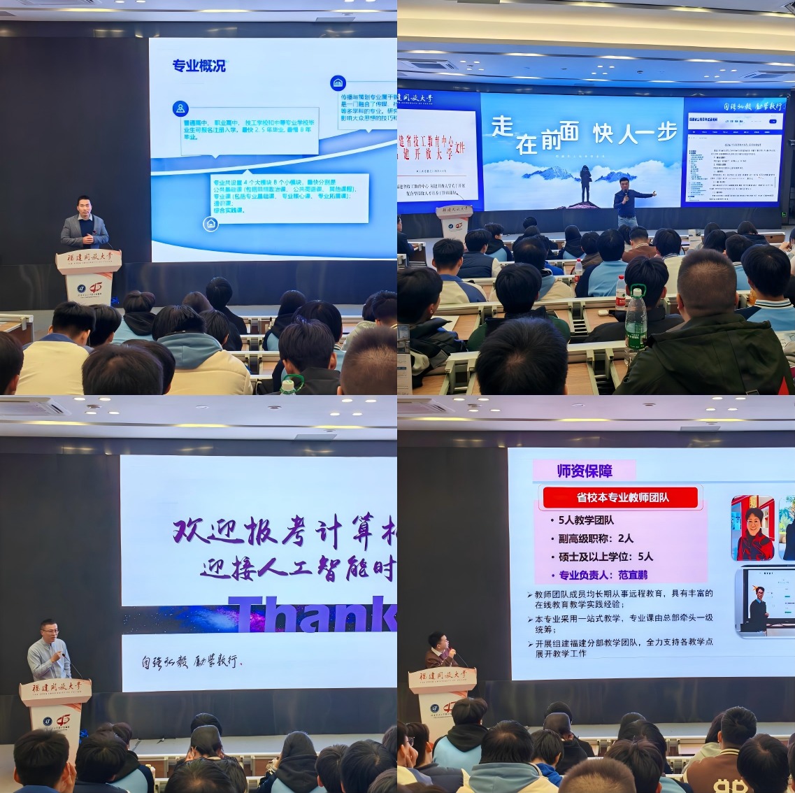 郑大忞详细介绍了弹性学制、线上线下融合教学方式以及开放教育的丰富教学资源,并通过学生成长实例展示了灵活多元的办学模式和全方位的学习支持服务体系。随后,理工学院副院长黄林昊教授、文经学院刘海波教授和理工学院林澍老师分别介绍了计算机网络技术、传播与策划、电气工程自动化等骨干专业,从师资力量、专业内涵、就业前景等方面为学生答疑解惑。